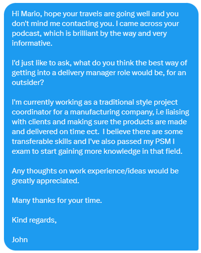 I came across The Delivery Manager Daily , a podcast by Mario Decristofano. Lot’s of great, well thought out subjects on there and listened with interest. I’ve learned, from the few DMs I’ve spoken too, that most have a job in the industry or related fields, project manager, Scrum Master etc. before moving into a DM role. So I really had to question, what would I, as a mere outsider, have to do to get in? What makes a difference, what skills, nuances and extra knowledge could help me on my way?